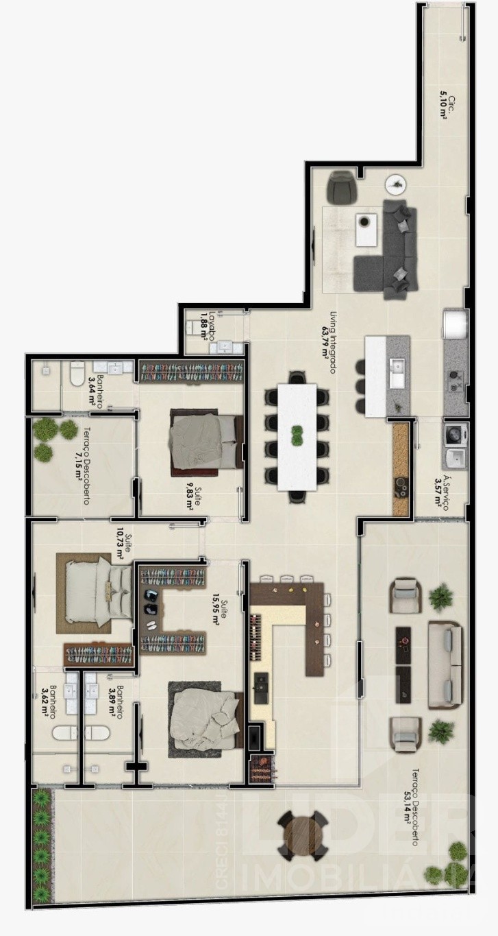 Apartamento com 3 dormitórios sendo 3 suítes, 2 vaga de garagem, living integrado, lavabo, área de serviço, terraço descoberto com piscina, e uma área privativa de 208,00m².