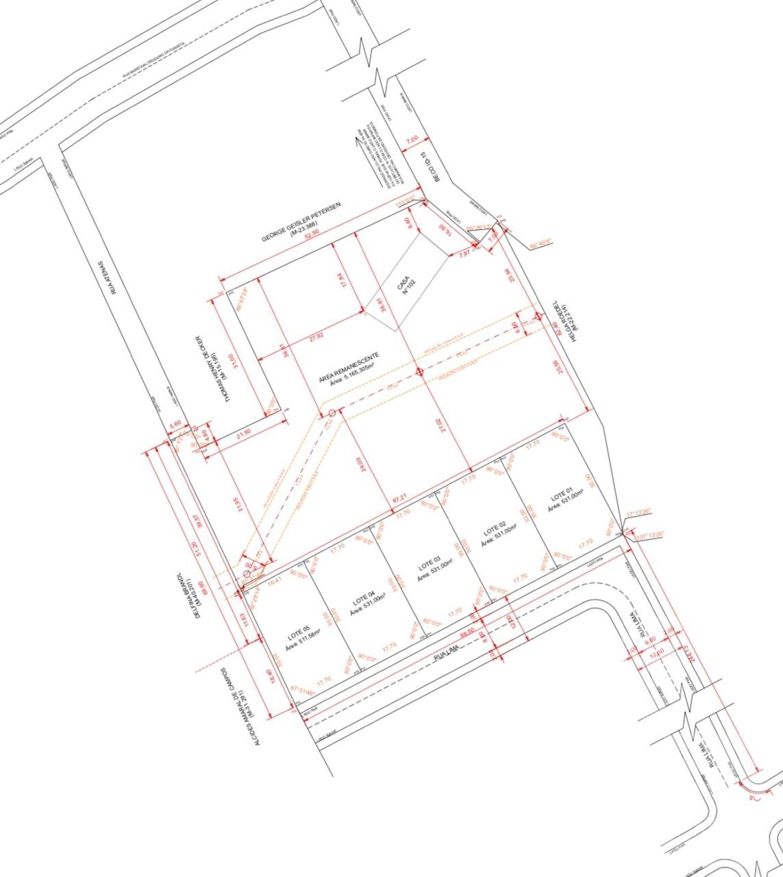 Um terreno que está dividido entre 5 unidades de terreno, sendo 4 unidades com 531,00m² e 1 unidade com 511,00m². Frente de 17,70m e lateral com 30,00m.